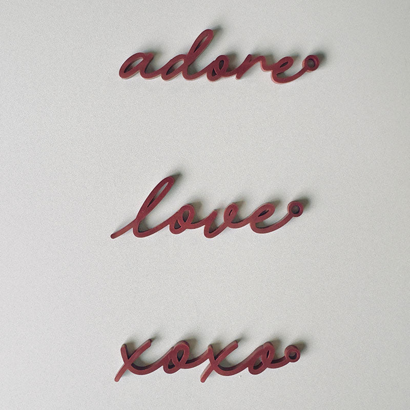 Garnish (1): 2 1/2" x 1/2" burgundy acrylic affectionate word cutout - "love" / "adore" / "xoxo". Choose which word speaks to you most.