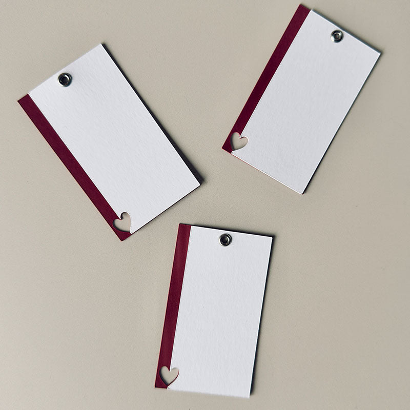 Gift Tags (1): 2 3/4" x 3" dual-layered rectangular tag featuring a burgundy cardstock bottom layer with a heart cutout, and a peek-a-boo half heart cutout on the top layer of white cardstock, completed with a silver grommet.