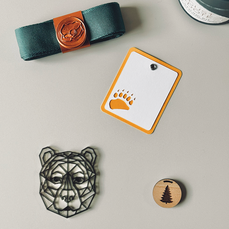 Gift Tags (3): 2 1/2" x 2" dual-layered rectangular tags with rounded corners featuring a top layer of white cardstock with an animal paw cutout to coincide with their respective animal garnishes, backed with marigold cardstock, completed with a silver grommet.